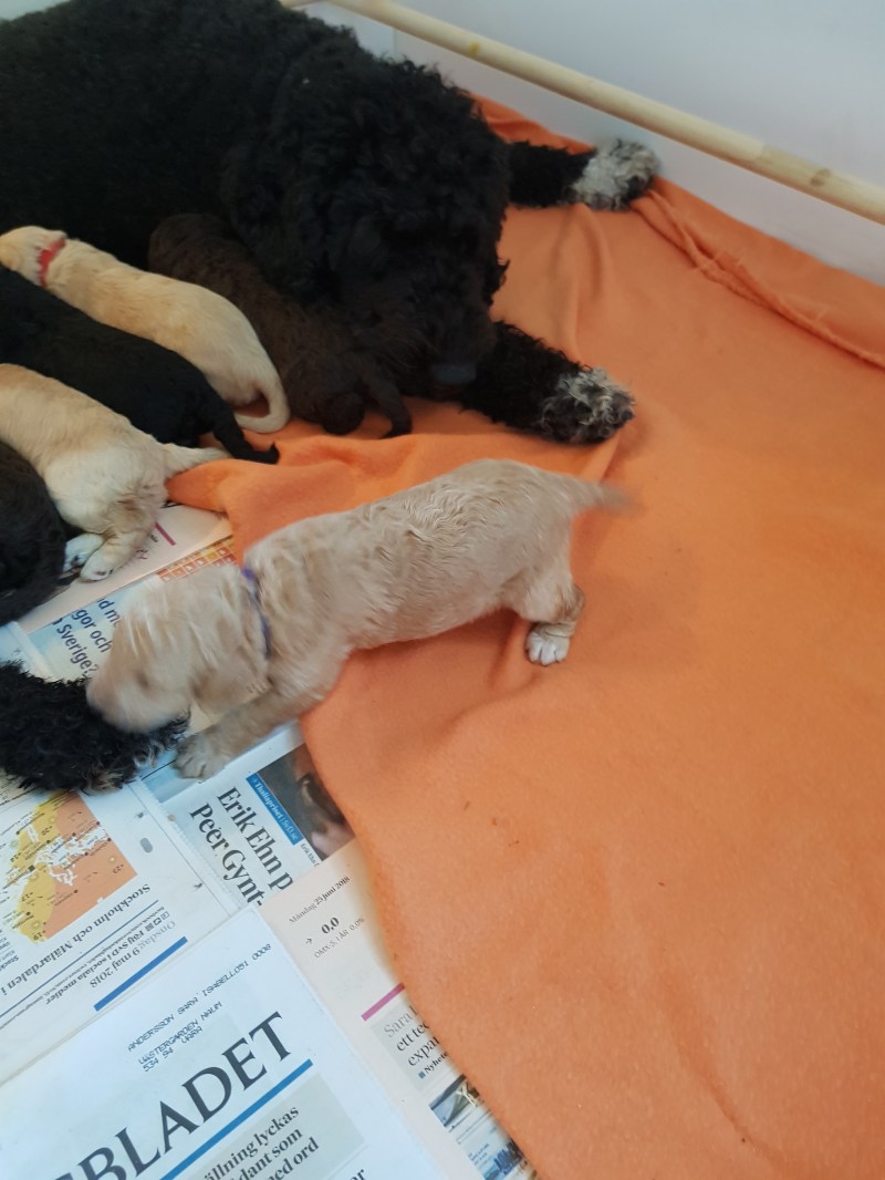 På vingliga ben försöker valparna alltmer ta sig fram. Ett par steg bara, ännu så länge, innan de välter över ända. Men träning ger erfarenhet och vem vet hur det ser ut i eftermiddag eller imorgon. Alla utvecklas i en rasande takt. Vi är så stolta.