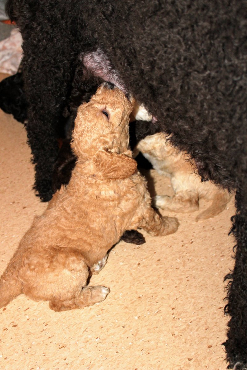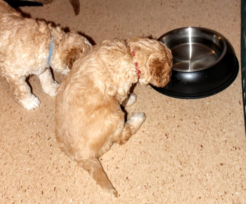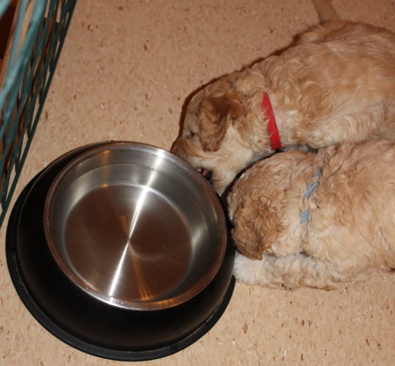 Kullen börjar upptäcka vatten! Zeke ses på bilden attackera skålen och sen dricka försiktigt. Några föredrar fortfarande att dricka mjölk, Ipa och Bobbi är ofta sist kvar i mjölkbaren. Tintin och Malte äter gärna valpfoder med god aptit.