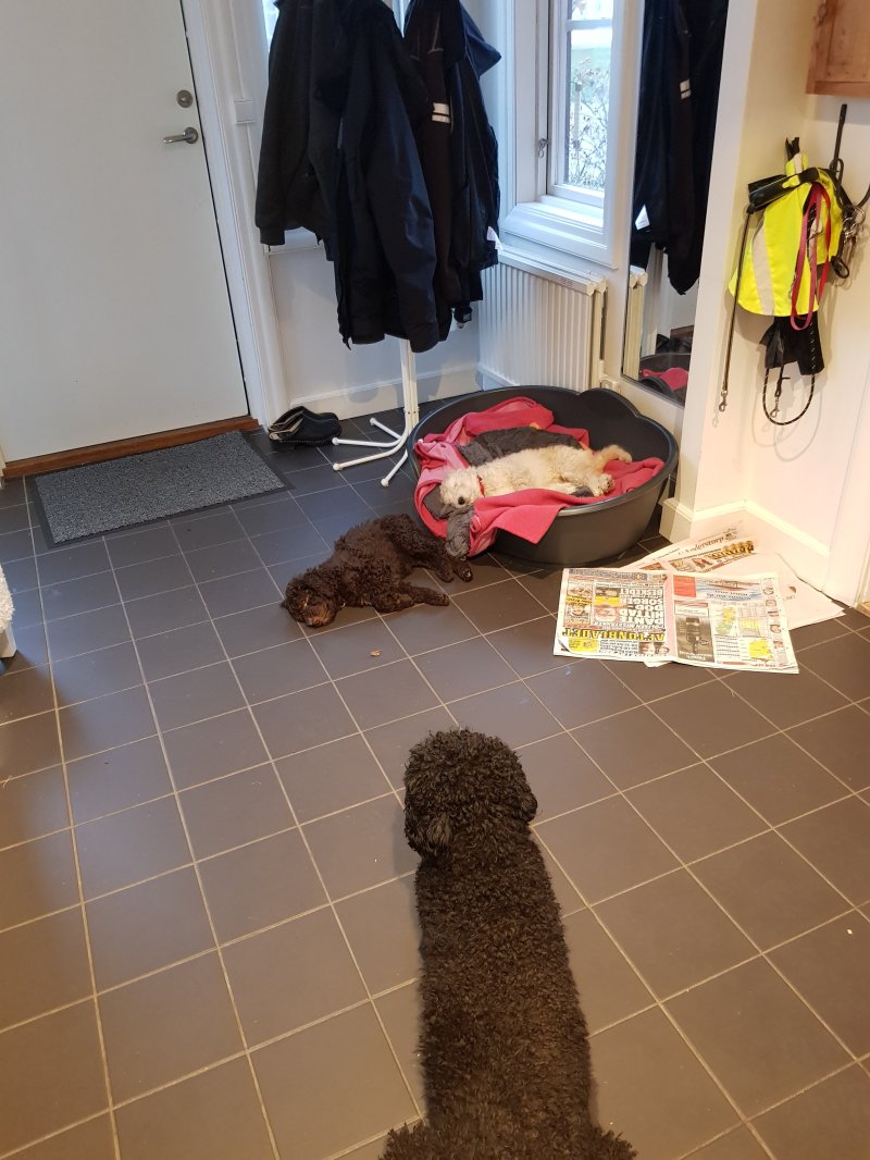 Det tar på krafterna att gå i koppel. En kort promenad på trehundra meter gav många intryck och trassliga koppel. Mycket att smaka och lukta på. Nu processas alla intryck i sömnen med små ryckningar och pip.