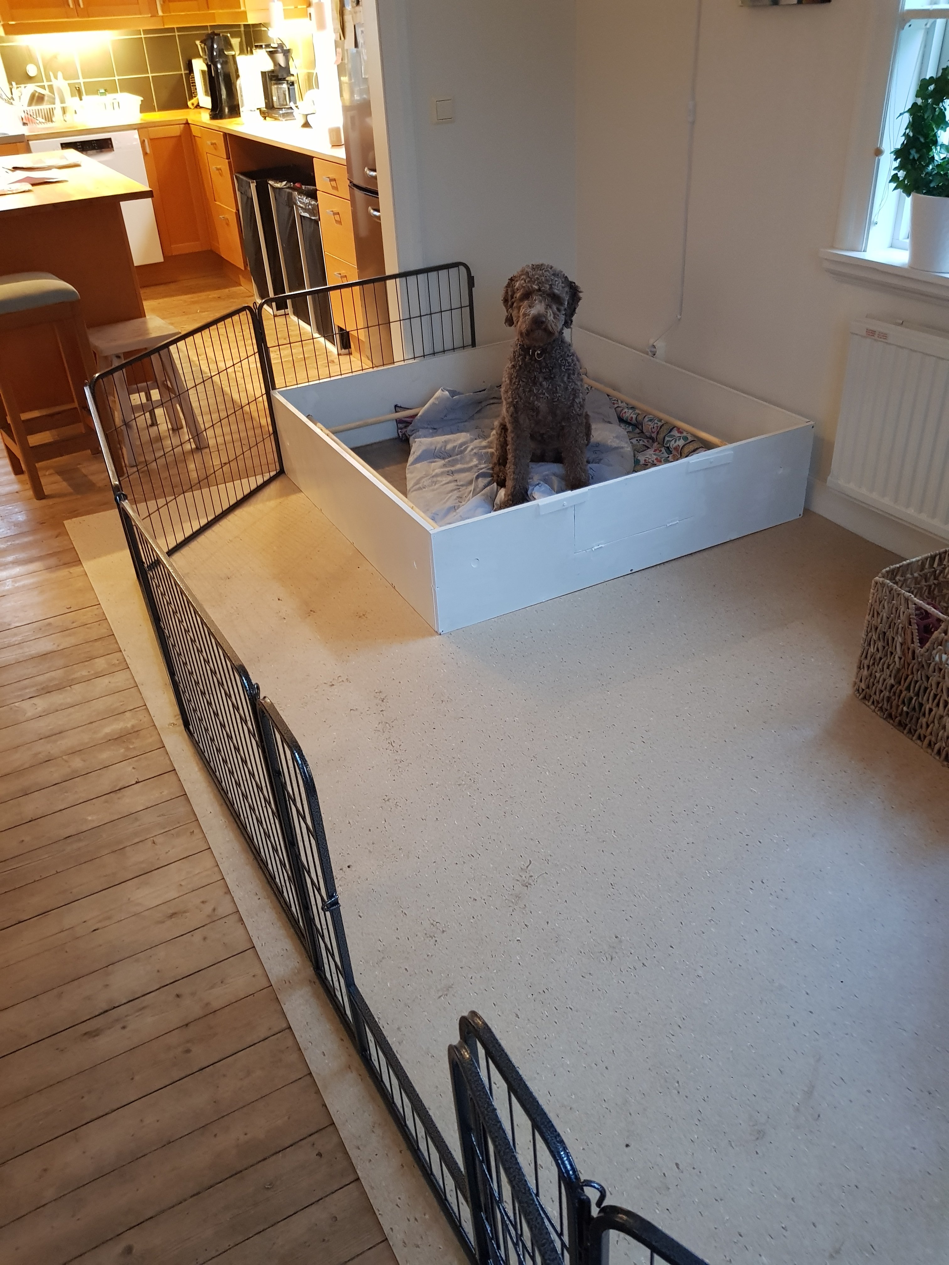 Nu är valplåda och nyinköpt valphage på plats. Det är bara valparna som saknas. Det inte Tintins tur förrän nästa år men testa får man ju gärna göra. Kanske minns hon också när hon låg i lådan för drygt ett år sedan.