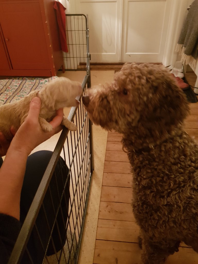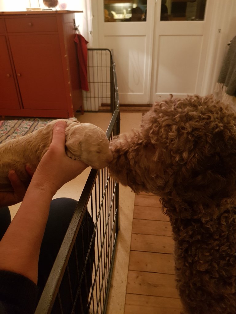 Tintin börjar mer och mer förstå att det faktiskt är små hundar i valplådan och inte bitleksaker. Övervakade möten är förstås ett måste ännu så länge men svansen går och hon nosar nyfiket. Nico nosar undrande tillbaka.