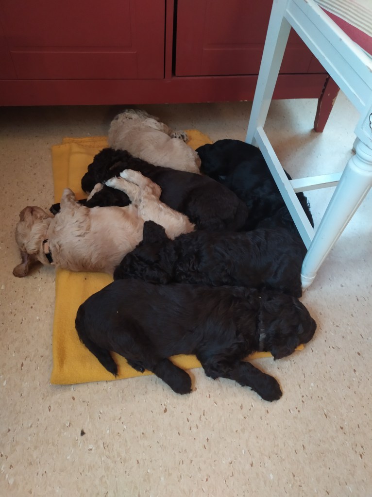 Valparna är nu så stora nu att de hoppar ur valplådan ut i valphagen. Där ligger en filt lämplig att kura ihop sig på tycker de. De trivs bäst riktigt riktigt nära.