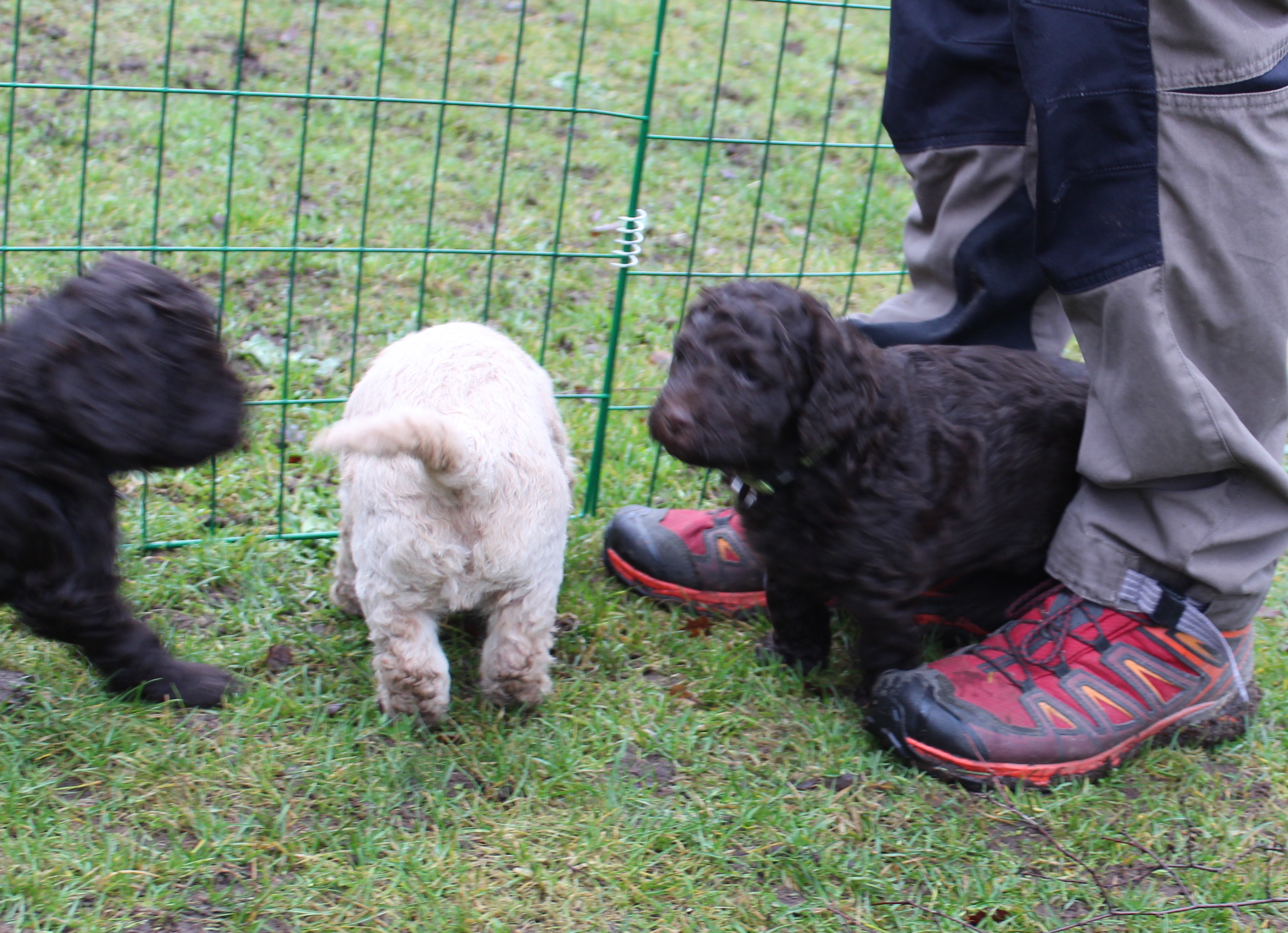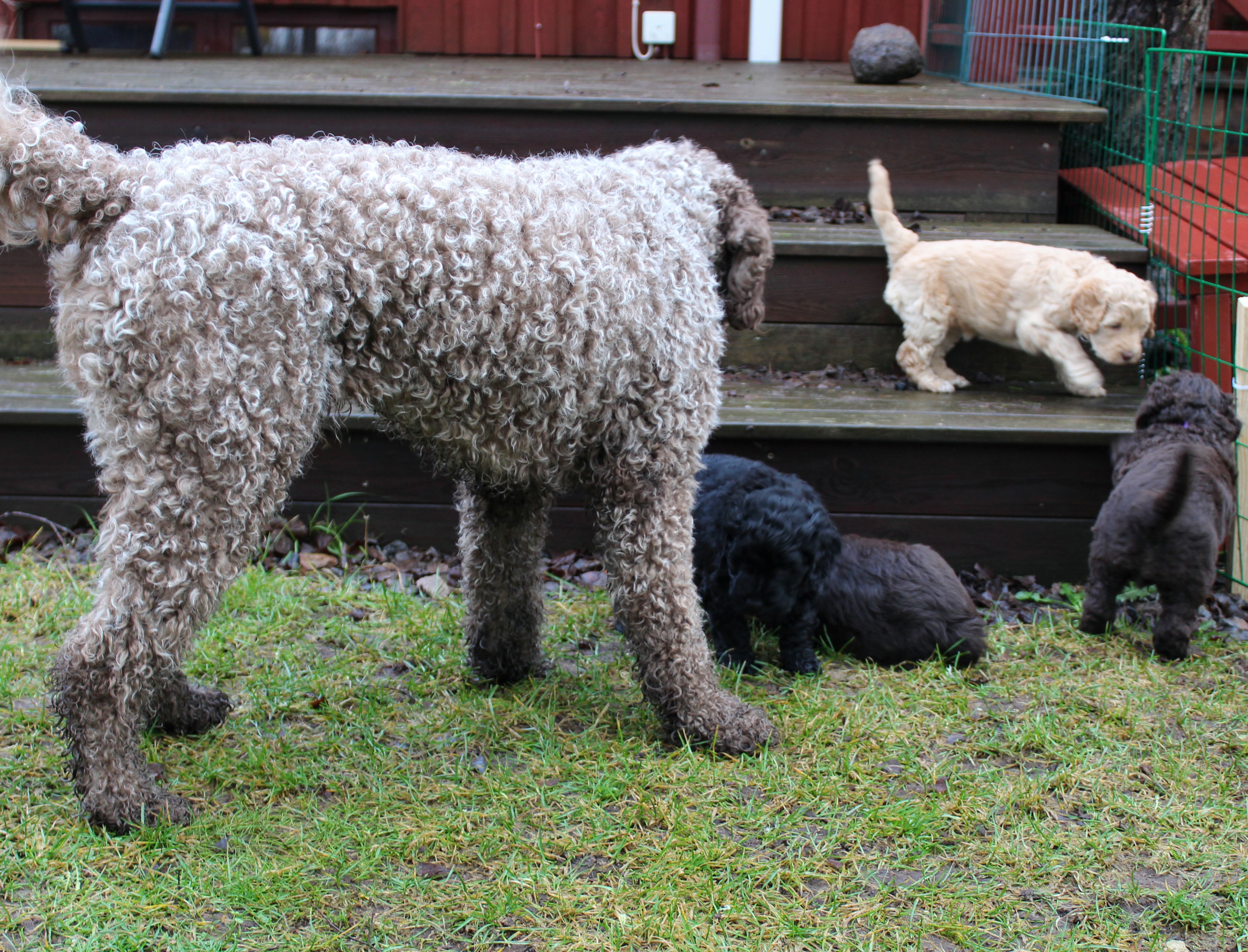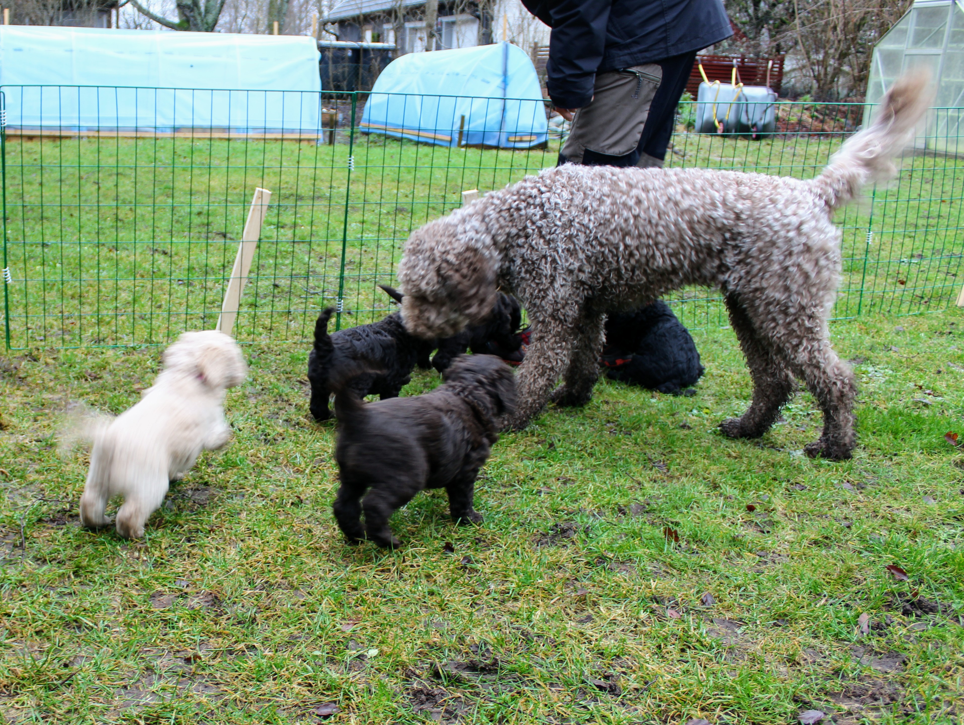 Idag fick vi oväntad hjälp av syster och svåger att bygga valphage ute. Så bra, det tackar vi för! Här kommer några bilder från valparnas första vistelse ute i det fria.