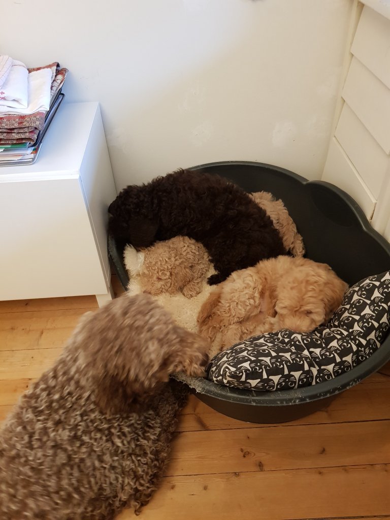 Vi är på tillfäligt besök uppe på övervåningen. Husse tror att det ska hjälpa till att ge honom lite lugn och ro för att utföra lite arbete. Nja, det ska vi nog ta ur honom. Nya ställen att bita på, kissa över och kanske hitta på annat bus.