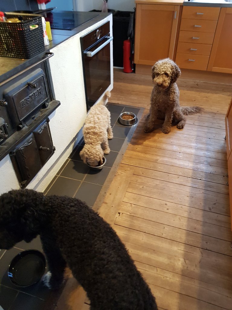 Harry äter numera med de stora vovvarna. De låter honom smaka av alla skålarna. Är man minst ska man väl tjäna lite på det. Vi får njuta av hans sällskap för i morgon eftermiddag ska han också få komma till sin familj.