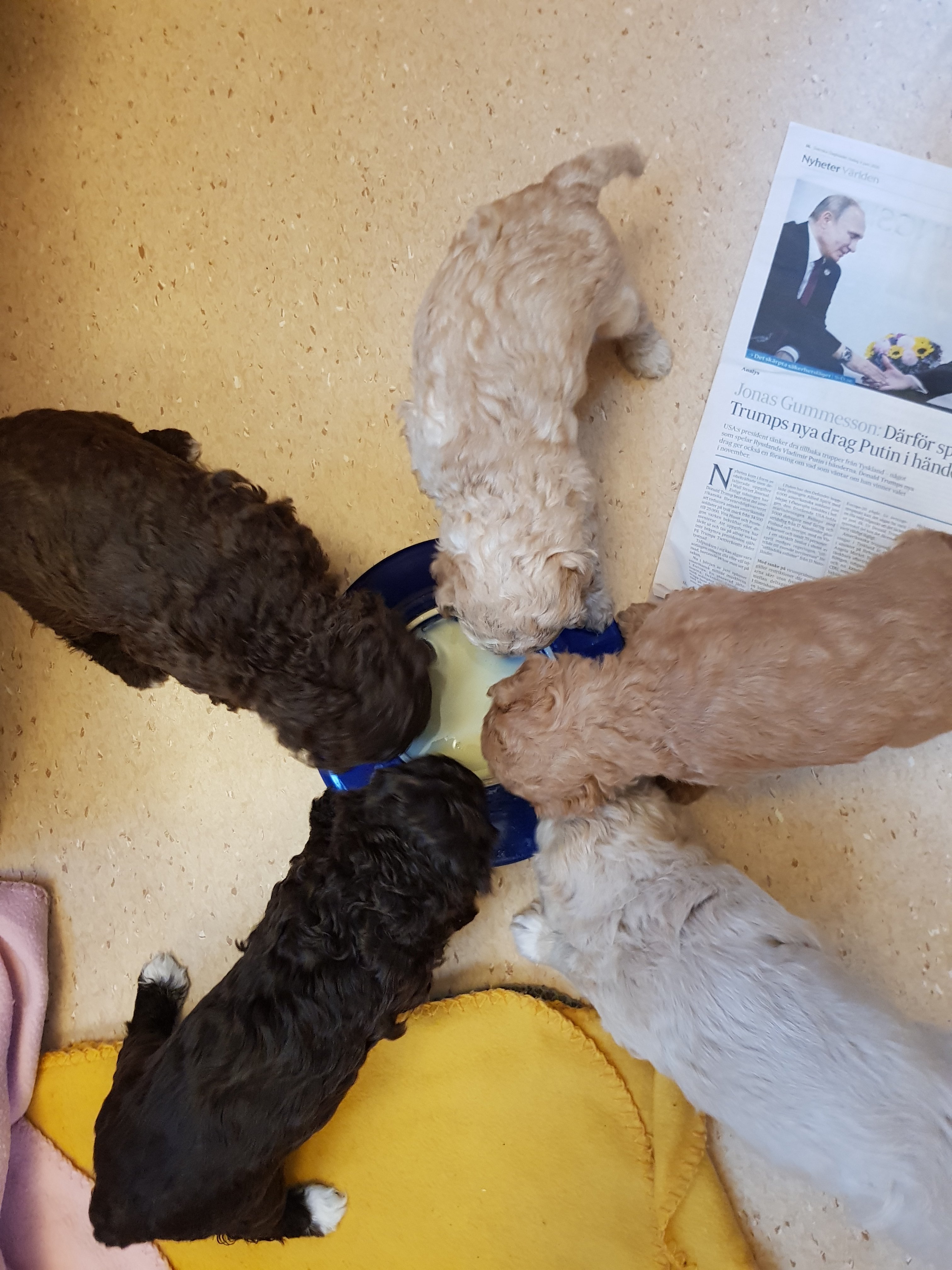 Valparna blir mer och mer vana vid att äta sin valpvälling. De radar upp sig fint runt skålen så alla får plats. Varken husse eller matte behövde gå in och styra upp det hela. Ytterst lättlärda valpar. De blir säkert rumsrena i ett nafs också. En liiten bit kvar bara innan vi är där.