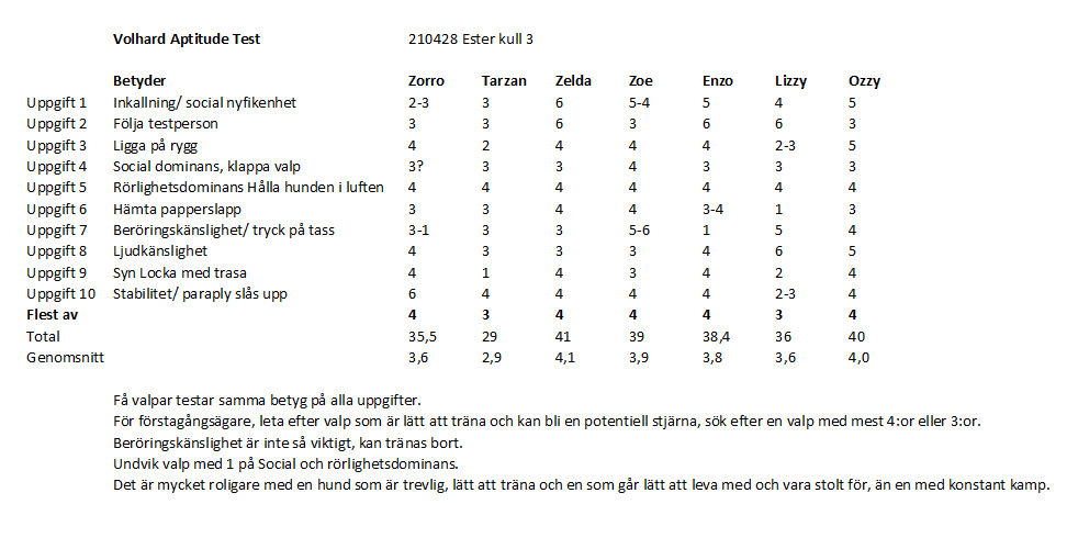 I testtabellen nedan ser vi att alla valpar i testet fått flest treor eller flest fyror. Vi skulle säga att Ester har flest fyror (lugn och smidig) och Tintin har flest treor (pigg och lättlärd).