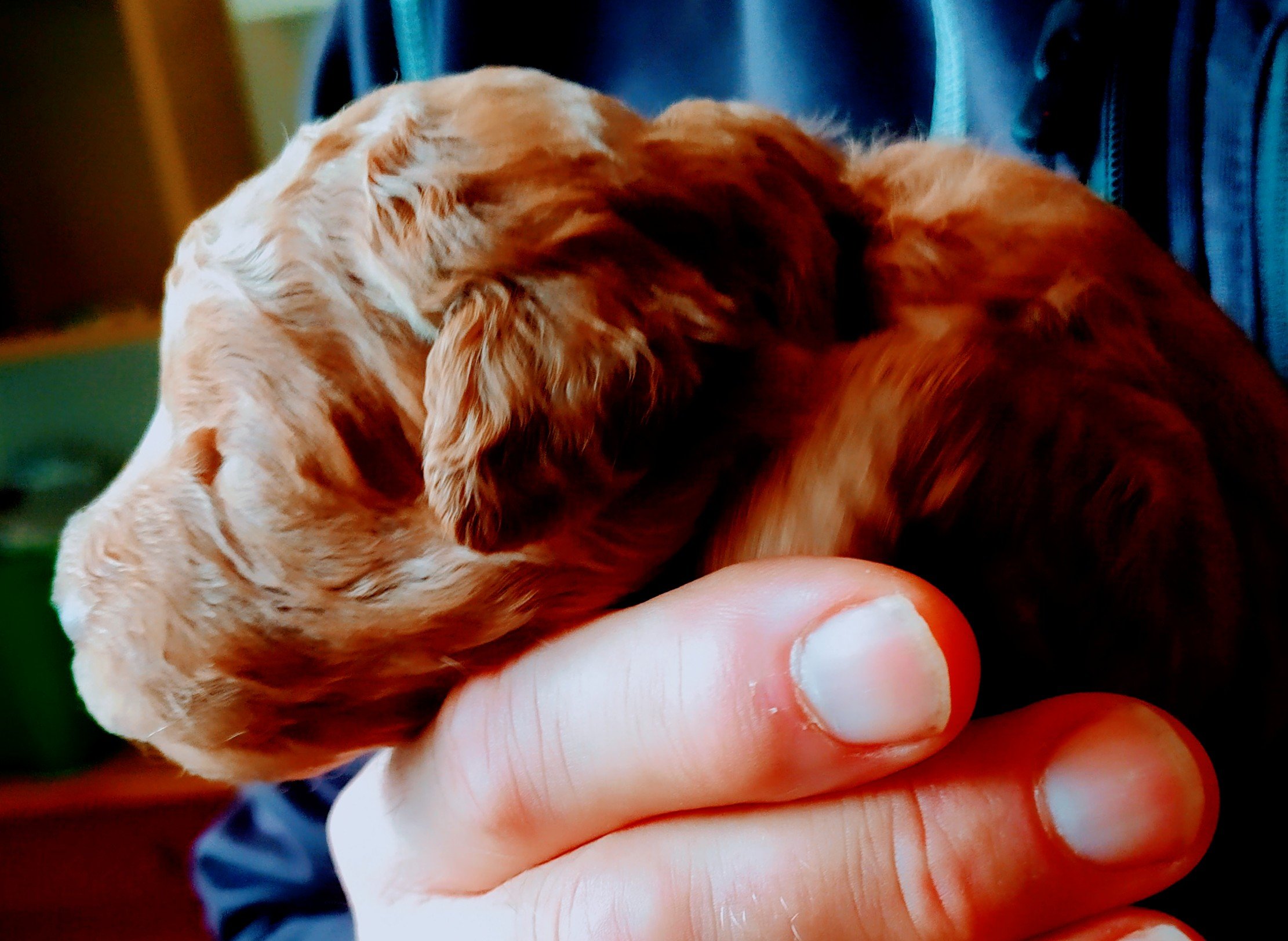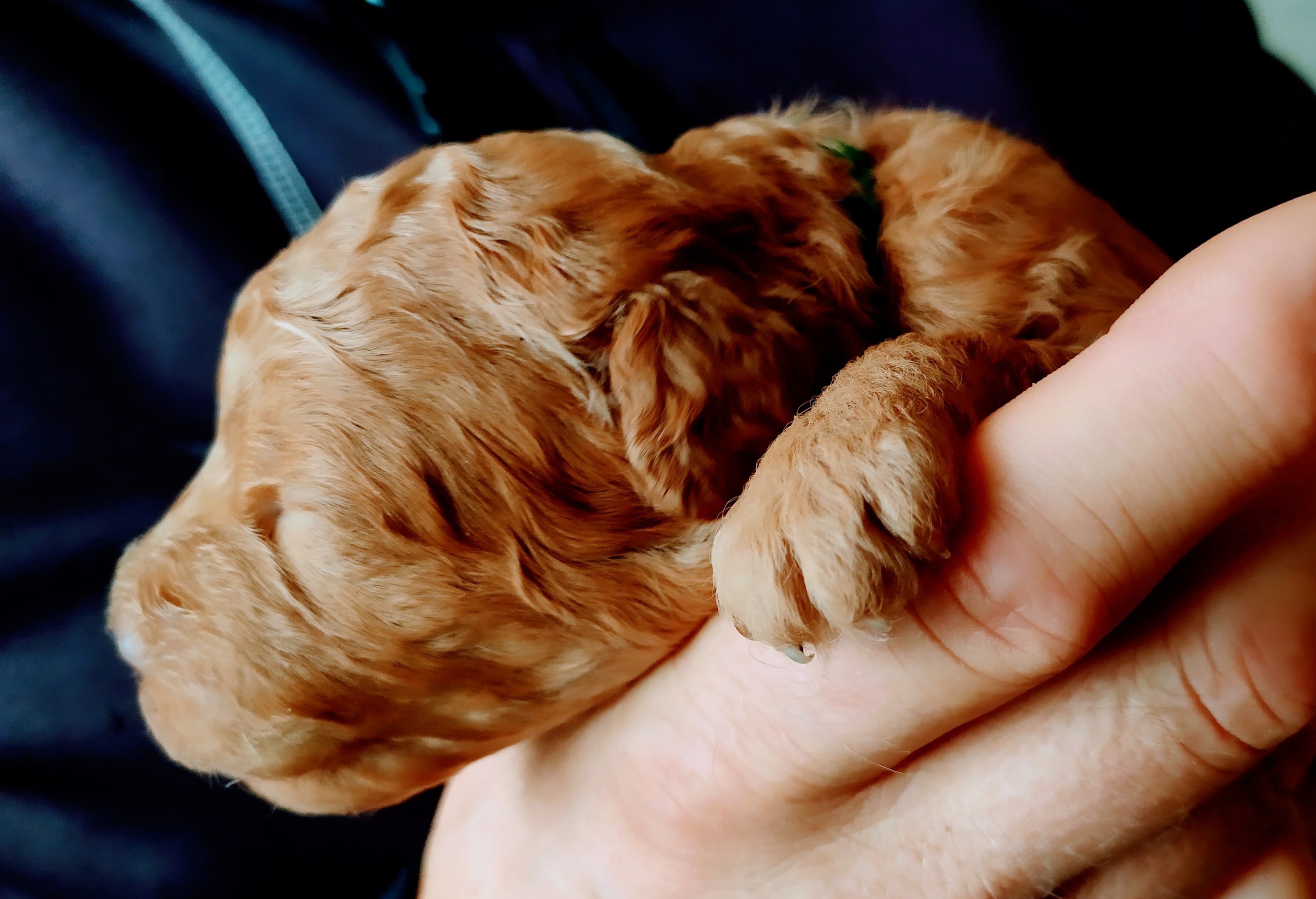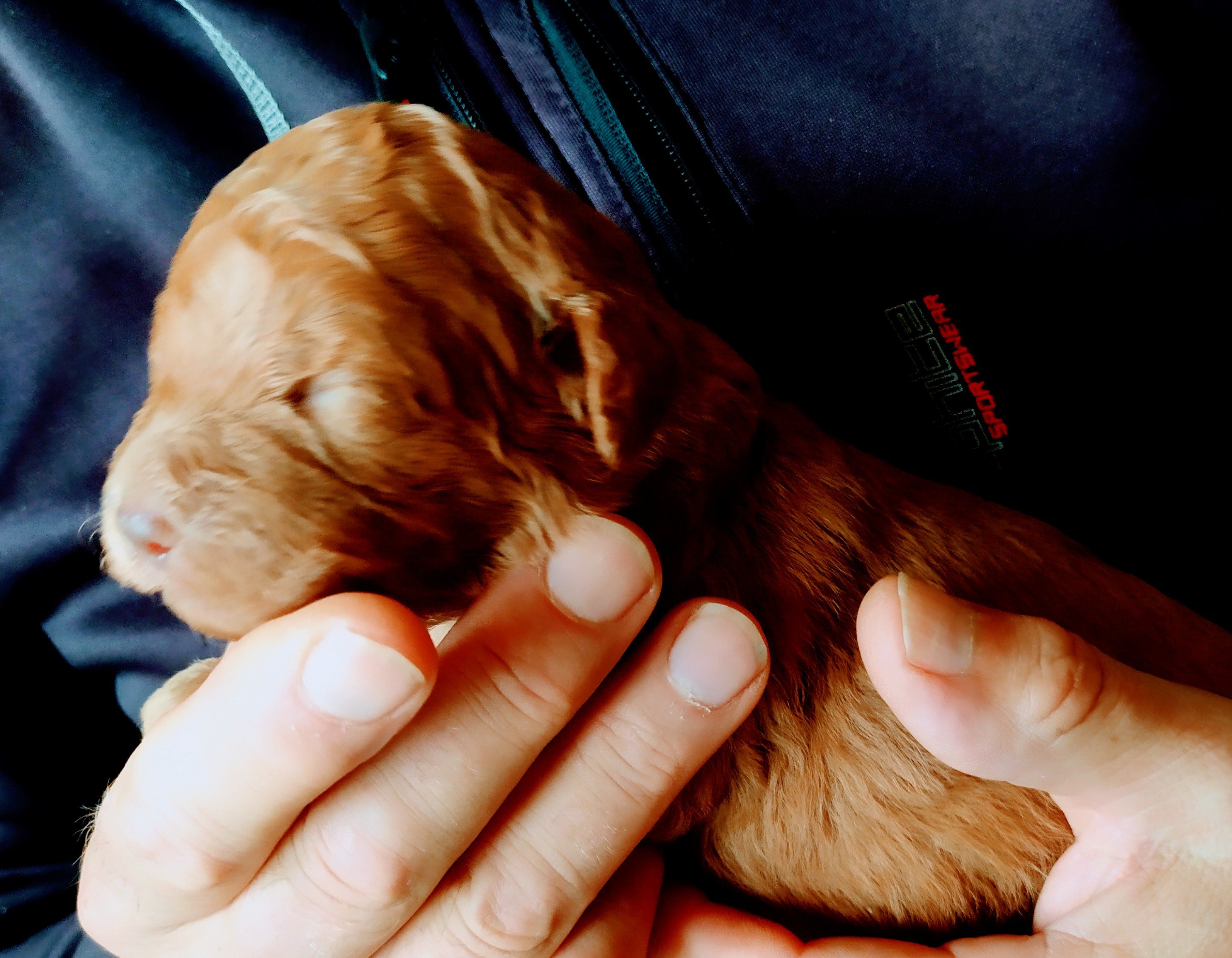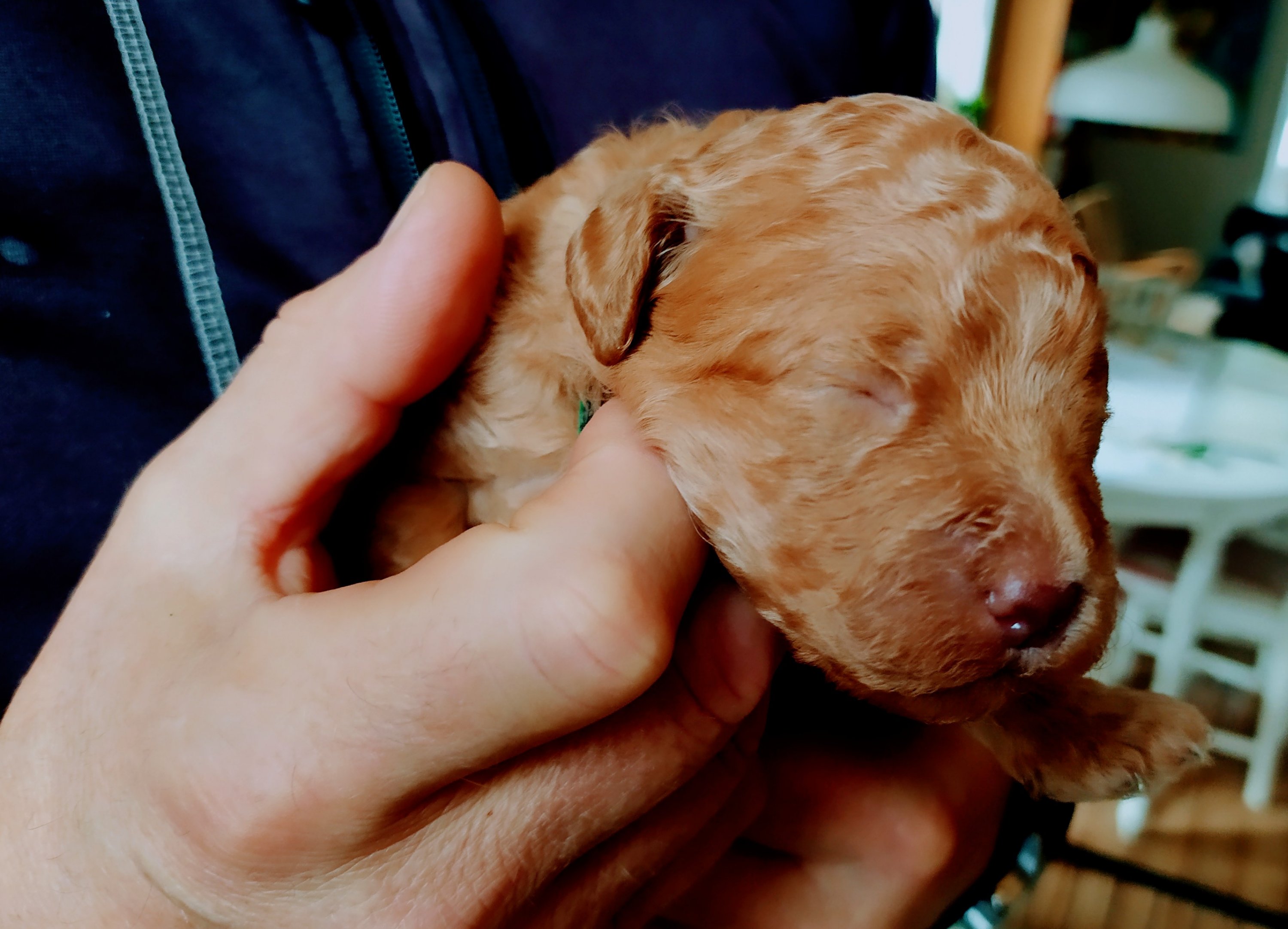 Detta är lilla Rio. Bilderna gör henne inte riktigt rättvisa – hennes päls har en utsökt vacker röd nyans. Hon föddes kl 17.30 den 28 september som först i kullen. Hon vägde då 287 g och har nu nästan tredubblat sin vikt. Imorgon är hon två veckor gammal och kan inom kort förväntas att öppna ögonen. Hon verkar vara framåt men medgörlig, precis så som en labradoodle ska vara. Hon ska bo hos en familj i Värnamo med tre pojkar som har väntat på henne sen förra året och vi tror att det blir en perfect match.