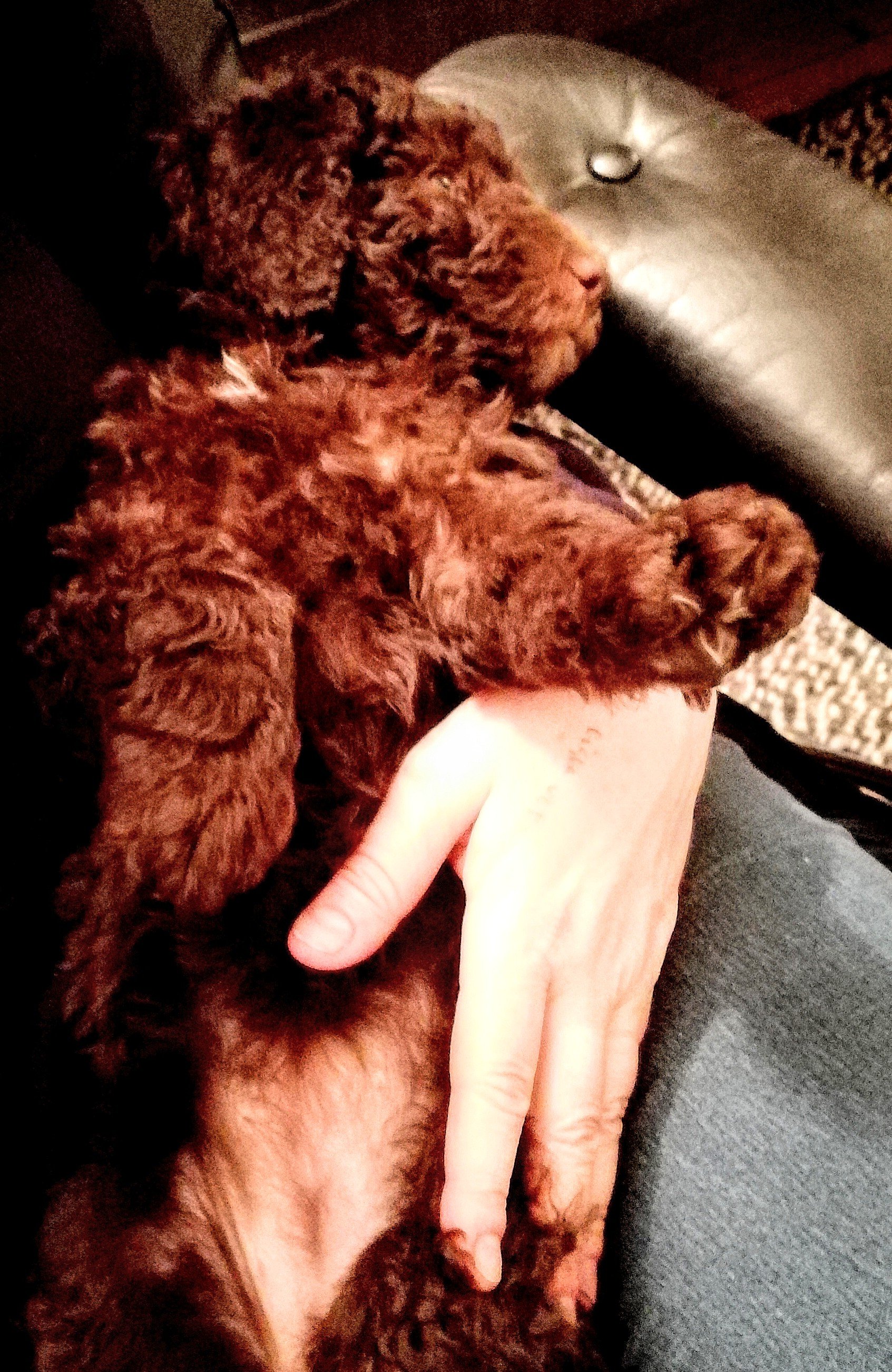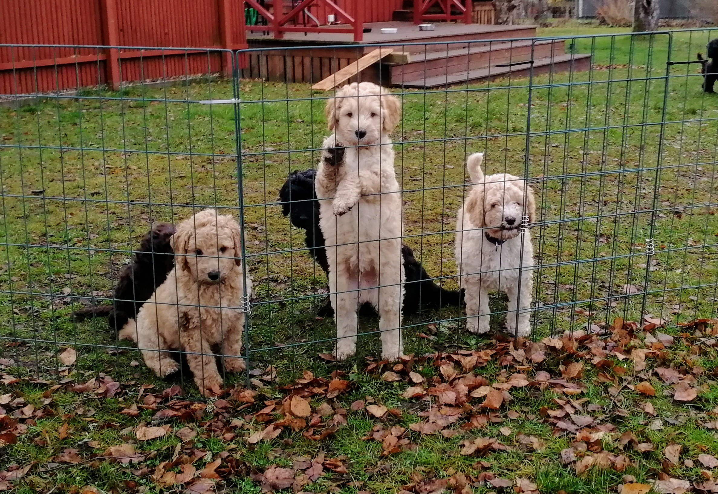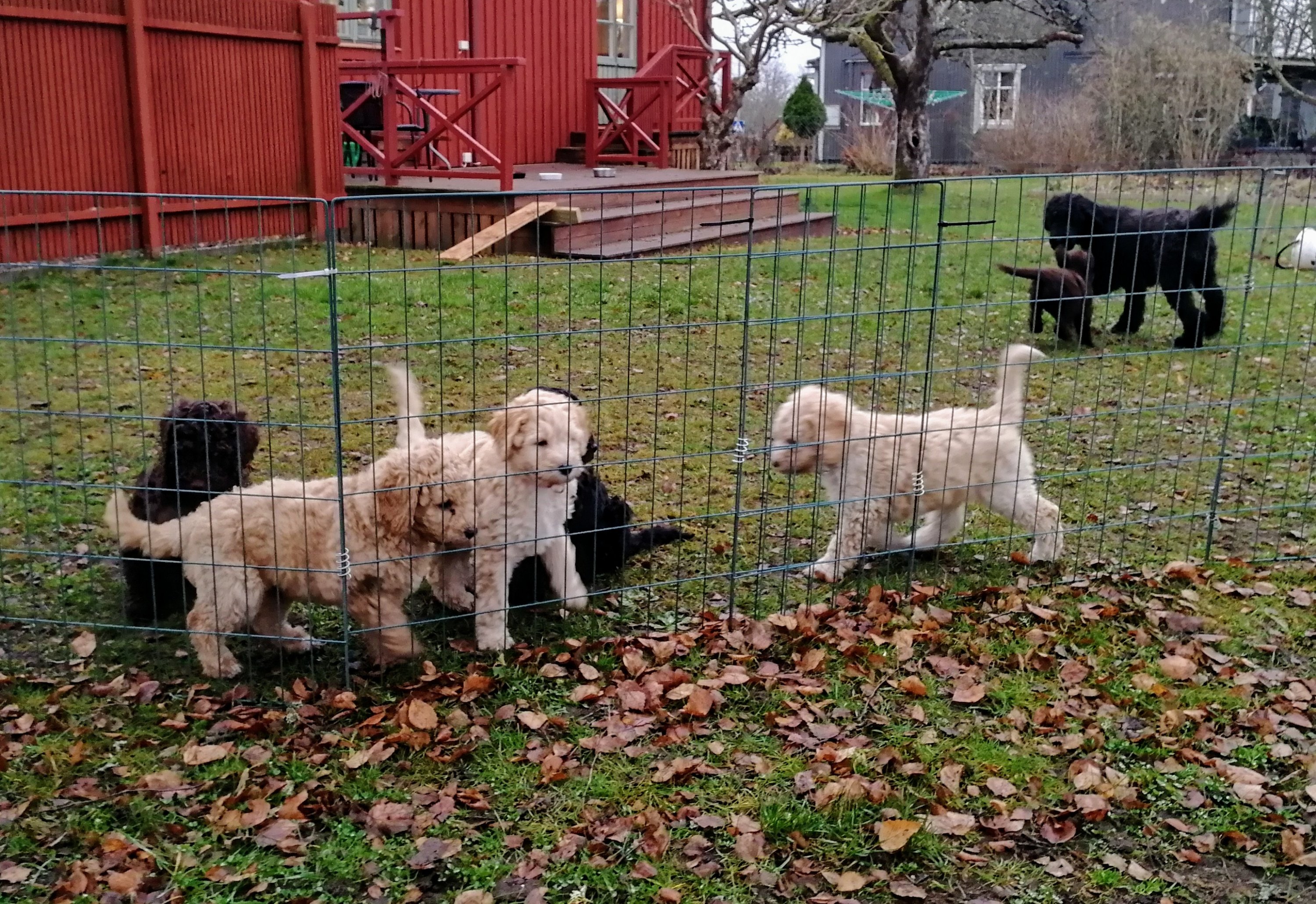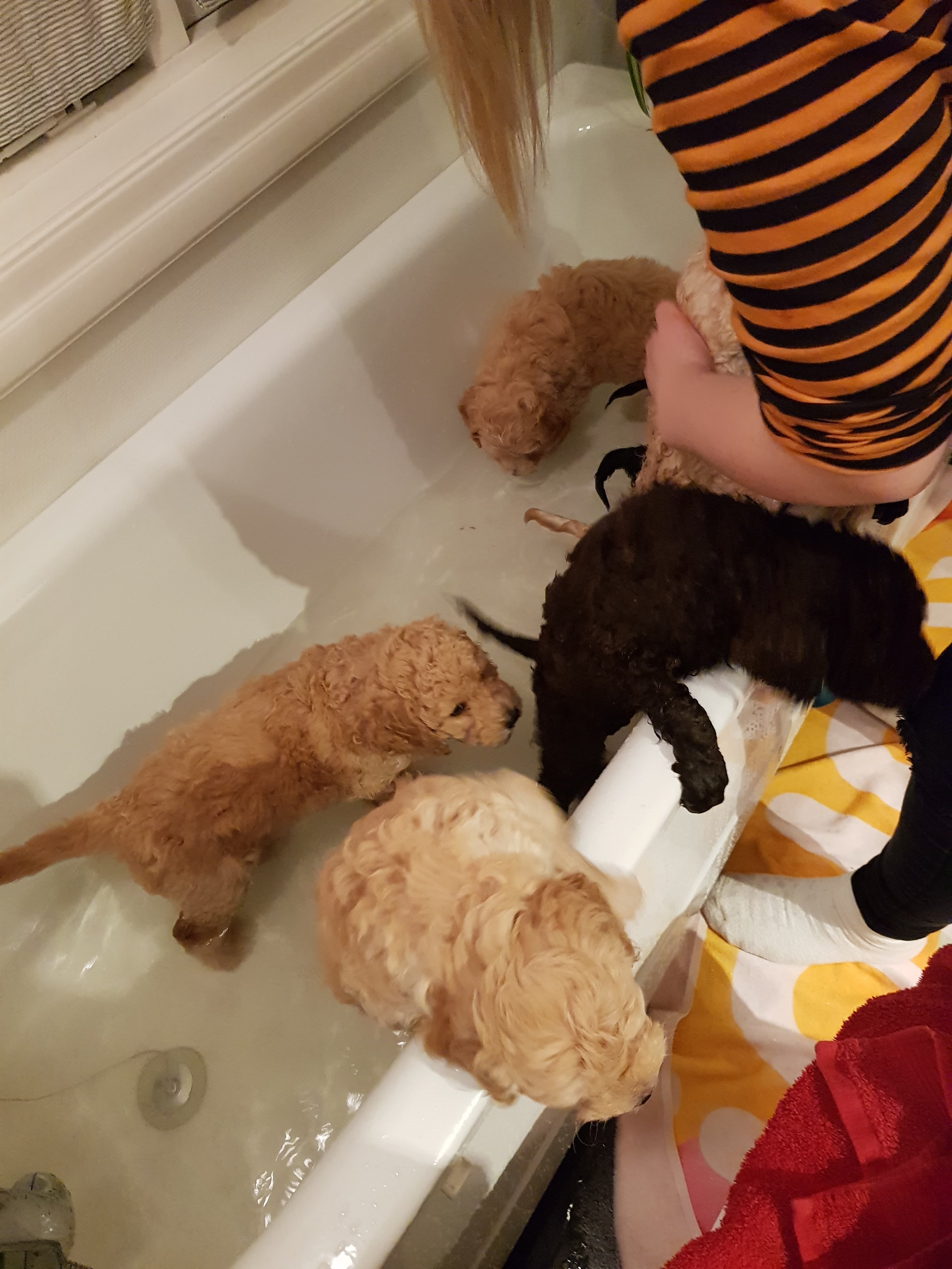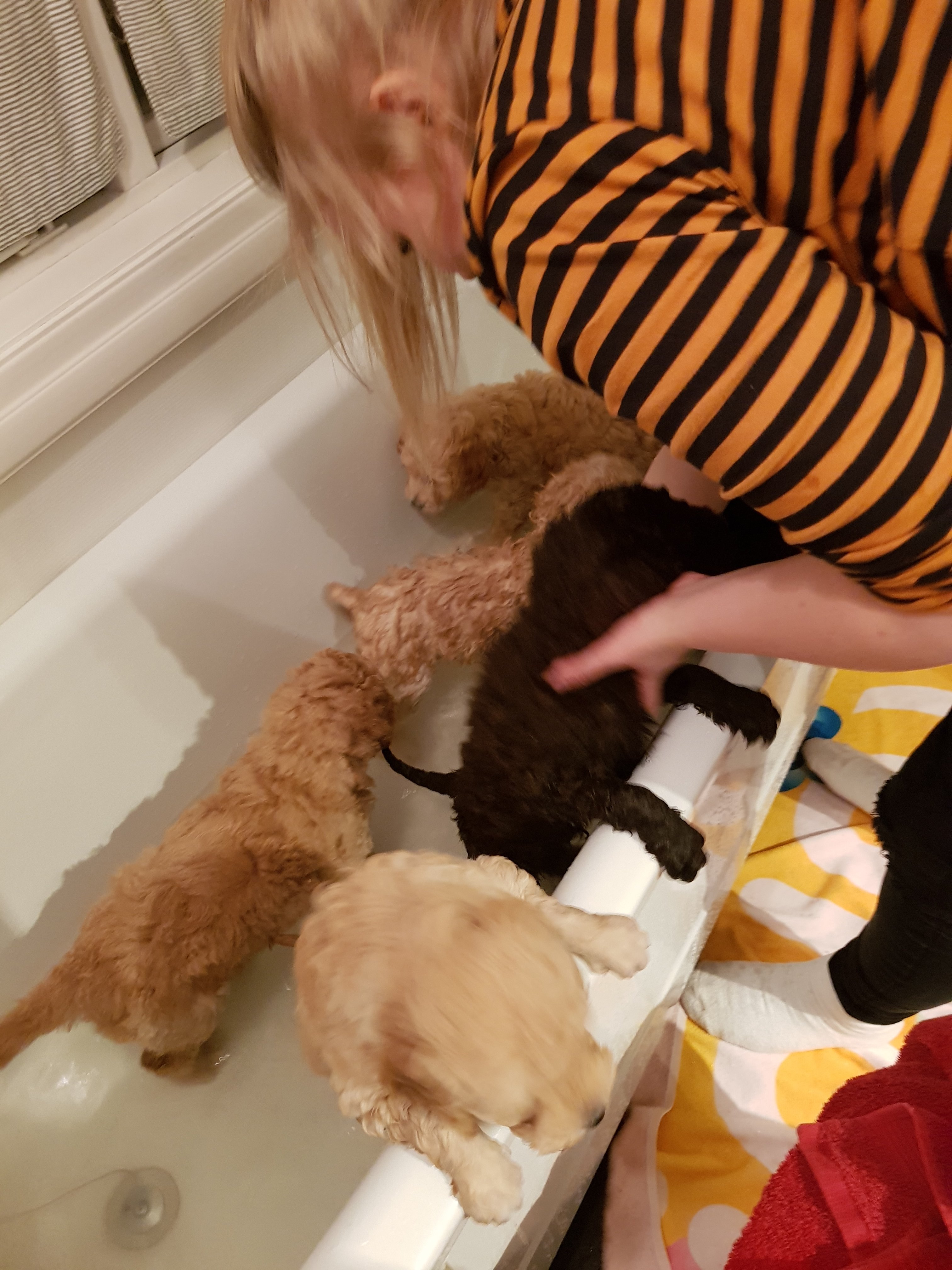 Sju små jordiga vovvar fick ta ett bad i förmiddags. Ingen vovve förstod vad det skulle vara bra för. Fönen ogillades starkt.