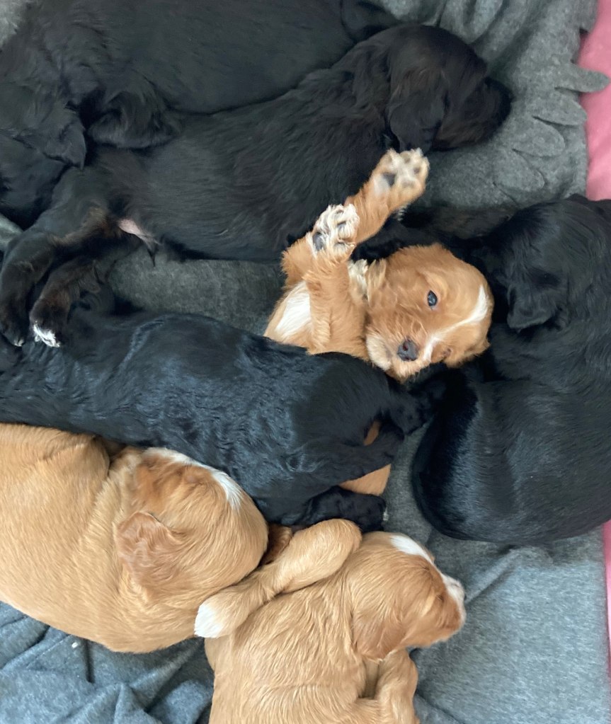 Hops är efter Pomonadalens Leia: http://labradoodle.nu/leia/ och importerade hanen Nalle från Hööks.https://www.labradoodle.se/vara-hundar/pinelodge-finn-nalle/